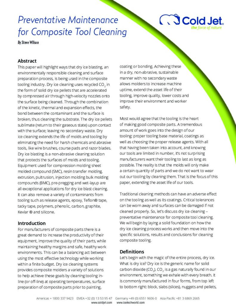 干冰清洗技术通过减少或消除对化学溶剂、钢丝刷和研磨垫的需求,延长了复合材料模具和工具的寿命。